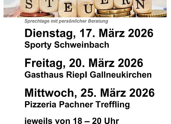 Die ÖAAB-Steuersprechtage 2026 kommen. Verschenken Sie kein Geld an das Finanzamt! Unsere Termine des ÖAAB Gallneukirchen Gallneukirchen und ÖAAB…